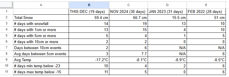 It is worth noting that this month has been particularly challenging. 19 days into December, we have already had 59.4cm of snow. For context, in the "worst" months of the previous three seasons, the totals were 66.7cm, 15.5cm, and 51cm. We have also had fewer days between major snowfalls, with an average of only 3 days between 5cm events this month. Additionally, we've had 11 days where temperatures were too cold for salt to be effective and cold enough for equipment to struggle.