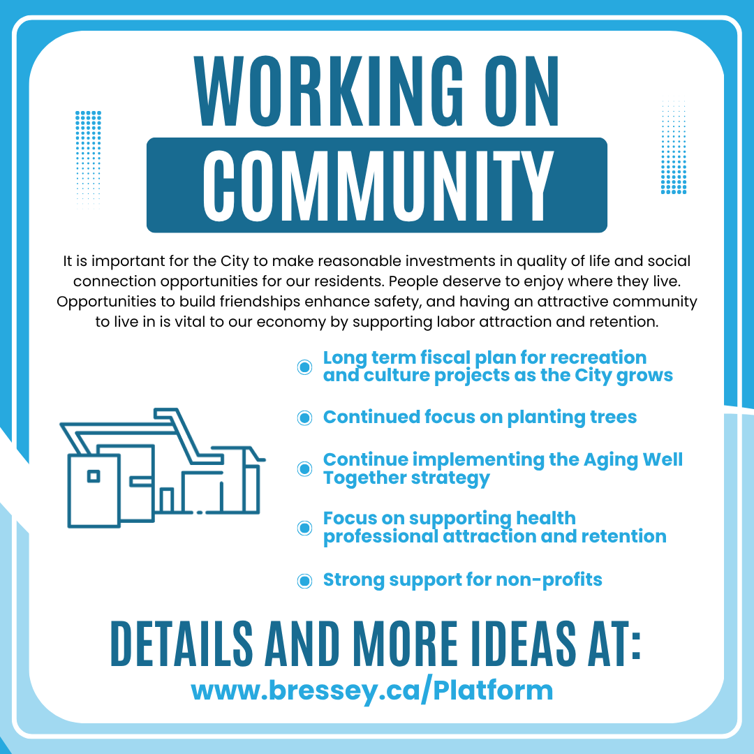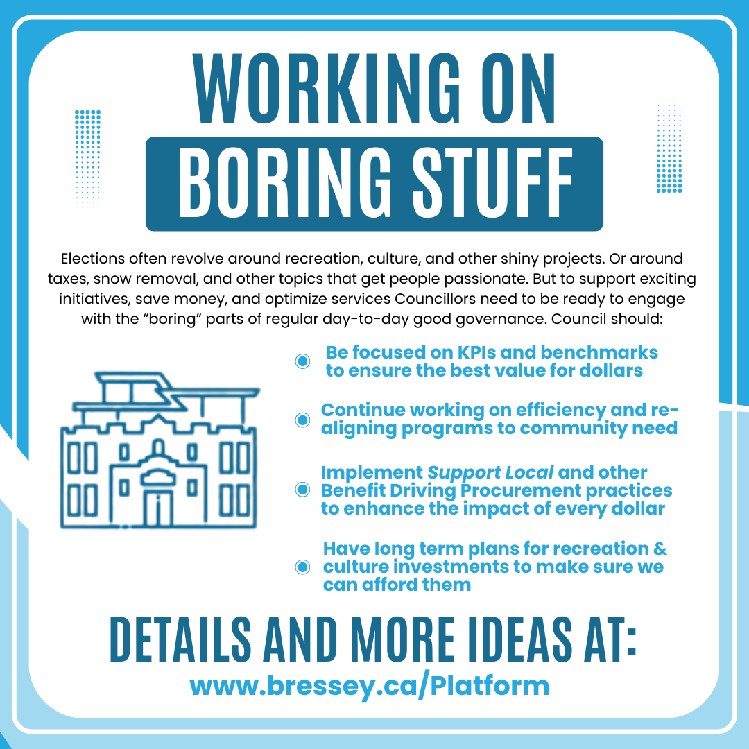 Laser-Focus on Efficiency: We must ensure we are maximizing the impact of every dollar. I will continue to champion initiatives like improving procurement, benchmarking salaries, measuring City performance, focusing on asset management, and creating long-term fiscal plans for major amenities. Council needs to have sustainable long-term plans and assurance that Administration is doing everything possible to be efficient.