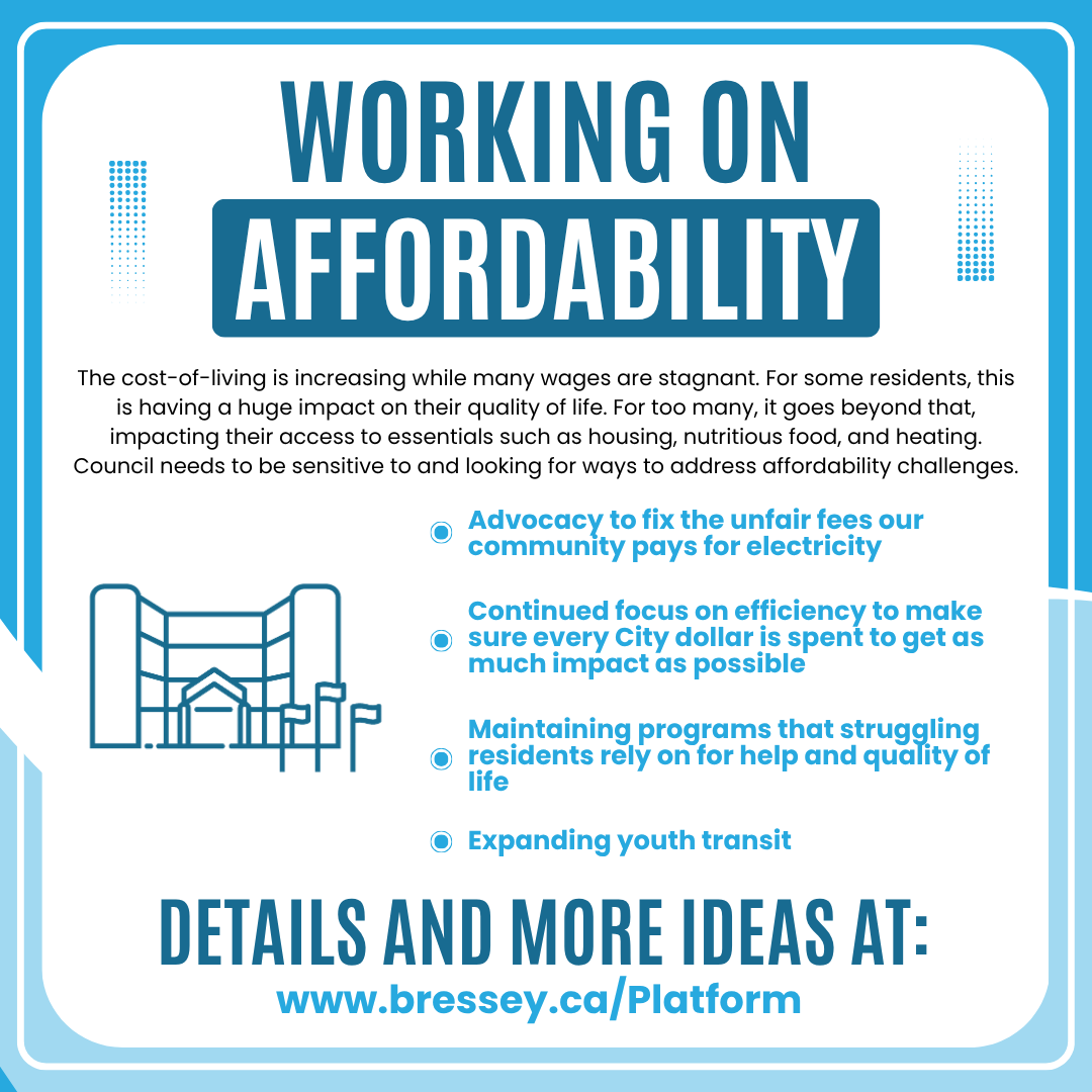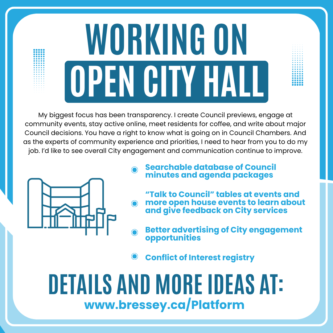 As you read and think about this, I would love to hear from you. What questions do you have? Where do you agree with me? Where do you think I’m out to lunch? What ways do you see that the City can save money or reduce low priority services? And what services do you think should be preserved no matter what? I’d love to talk over email (dylan@bressey.ca), social media, or the phone to either hear your thoughts, or setup a time to meet for coffee and really hash things out.